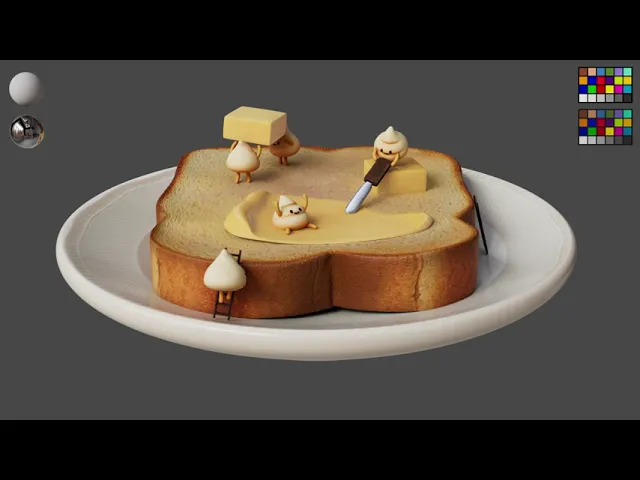 My inspiration comes from Tatsuya Tanaka, a Japanese miniature artist known for creating tiny figures interacting with everyday objects. He is especially famous for turning food into landscapes, architecture, and other imaginative scenes. I came up with a group of tiny butter workers busily spreading butter on a piece of toast.