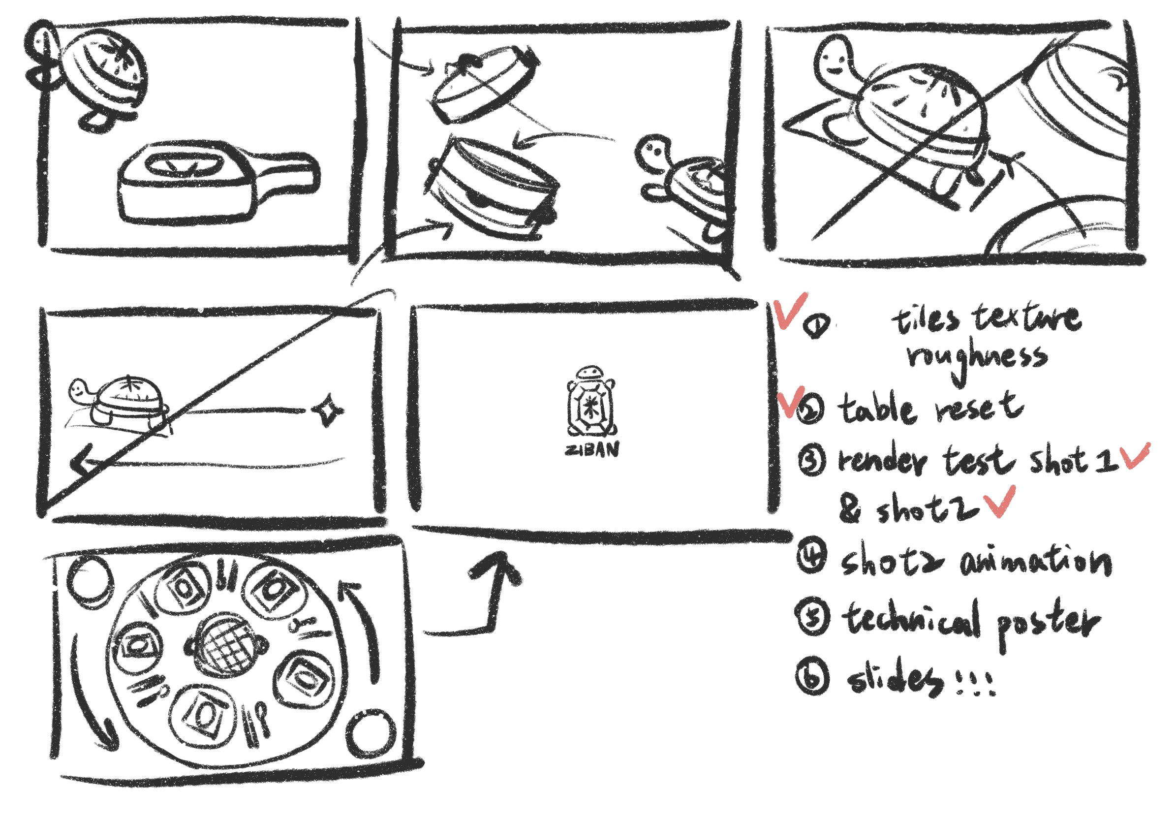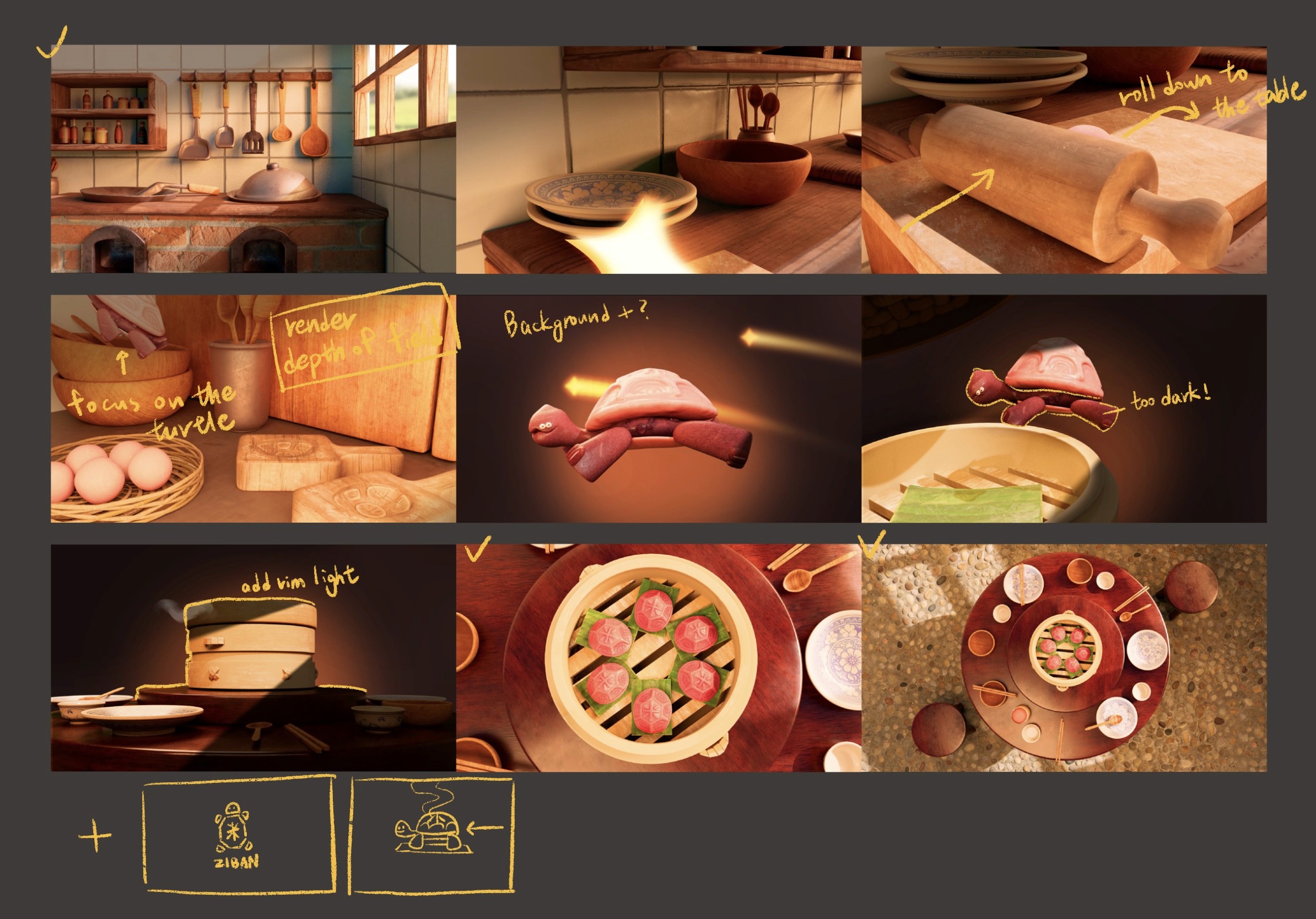 To keep the overall visual style consistent, I used playblast screenshots from Maya and placed shots side by side for comparison. I took notes on each frame to mark what needed adjustment before moving on to the final render.